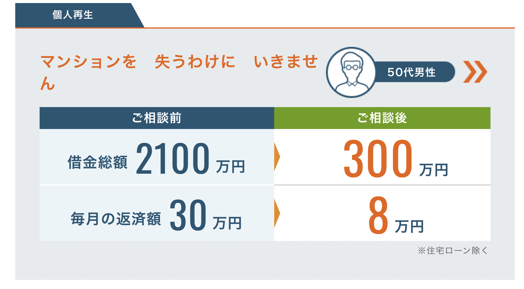 個人再生によって2,100万円もあった借金をわずか300万円まで大幅に減額できた事例です。個人再生手続きを開始する以前は、毎月の返済金額が30万円と高額でしたが、わずか8万円に減額できたのもこの事例のすごいところです。